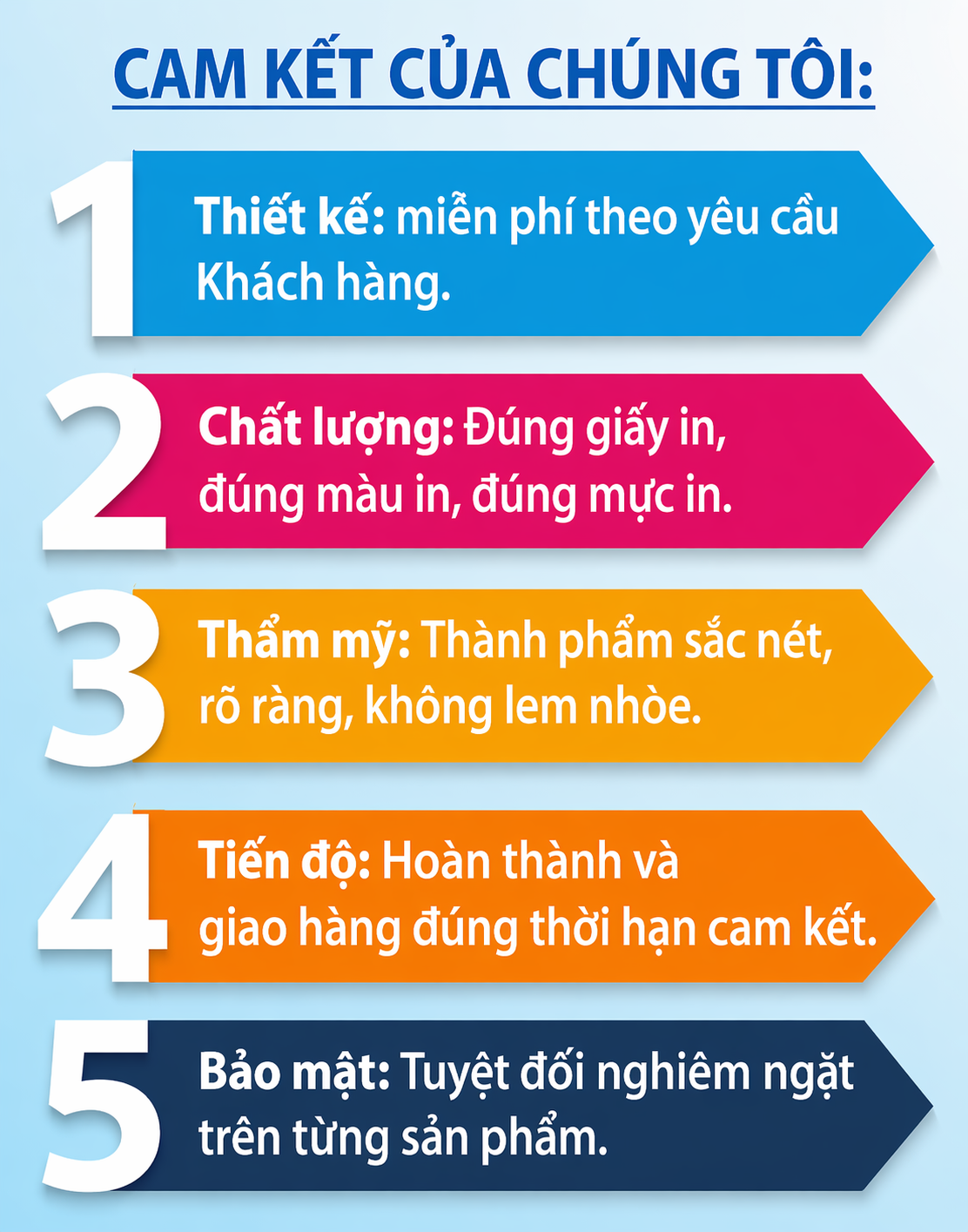 Dịch vụ in ấn chất lượng sử dụng công nghệ in hiện đại và vật liệu cao cấp, kết hợp với quy trình kiểm soát chất lượng nghiêm ngặt. Điều này đảm bảo sản phẩm có độ sắc nét, màu sắc trung thực và độ bền vượt trội, phù hợp với các sản phẩm quảng cáo, bao bì, sách và tạp chí.