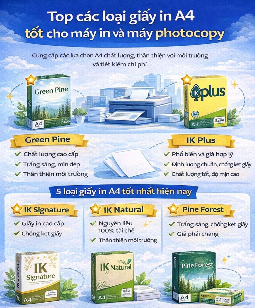 Các thương hiệu như Green Pine, IK Plus, IK Signature, IK Natural, Pine Forest đang trở thành lựa chọn đáng cân nhắc cho cả máy in và máy photocopy.